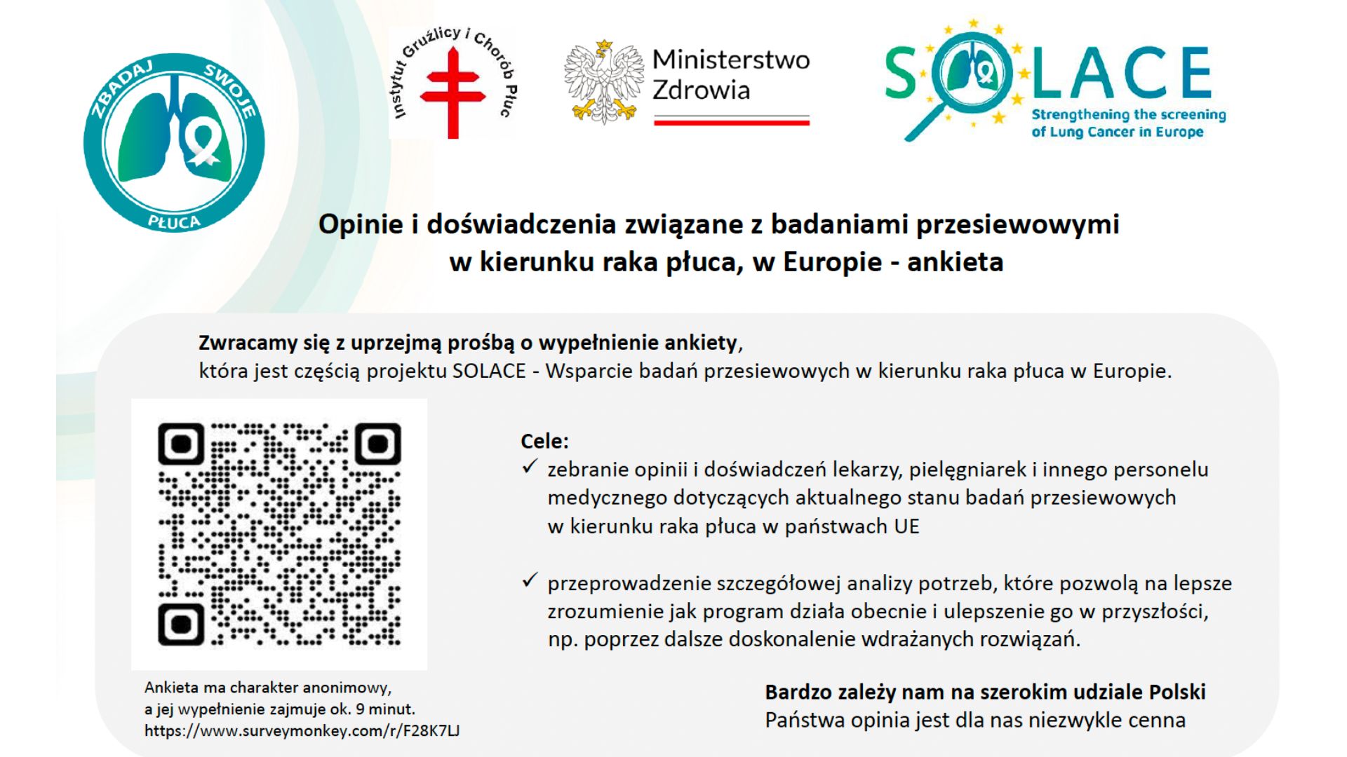 Zwracamy się z uprzejmą prośbą o wypełnienie ankiety, która jest częścią projektu SOLACE – wsparcie badań przesiewowych w kierunku raka płuca w Europie.